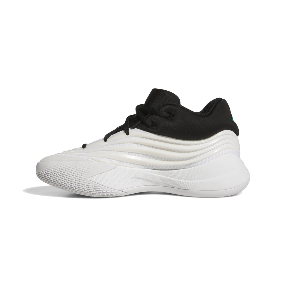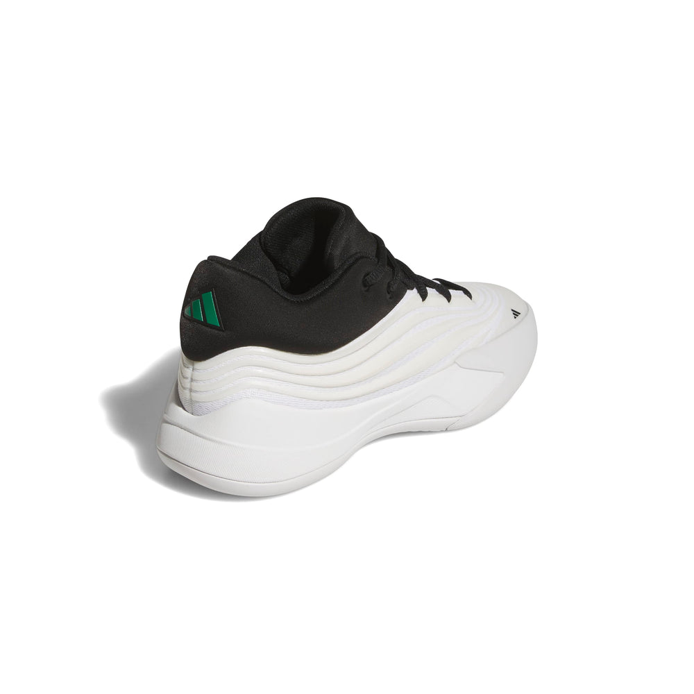 Ce modèle présente un coloris « Zero Metallic/Core Black/Court Green ». Il revisite le style « Stormtrooper » avec une base blanche métallisée, des touches de noir et des accents verts. Le logo Dame et la bride arrière apportent du contraste. Le résultat ? Une chaussure moderne, épurée et dynamique, idéale sur le terrain comme à la récré.