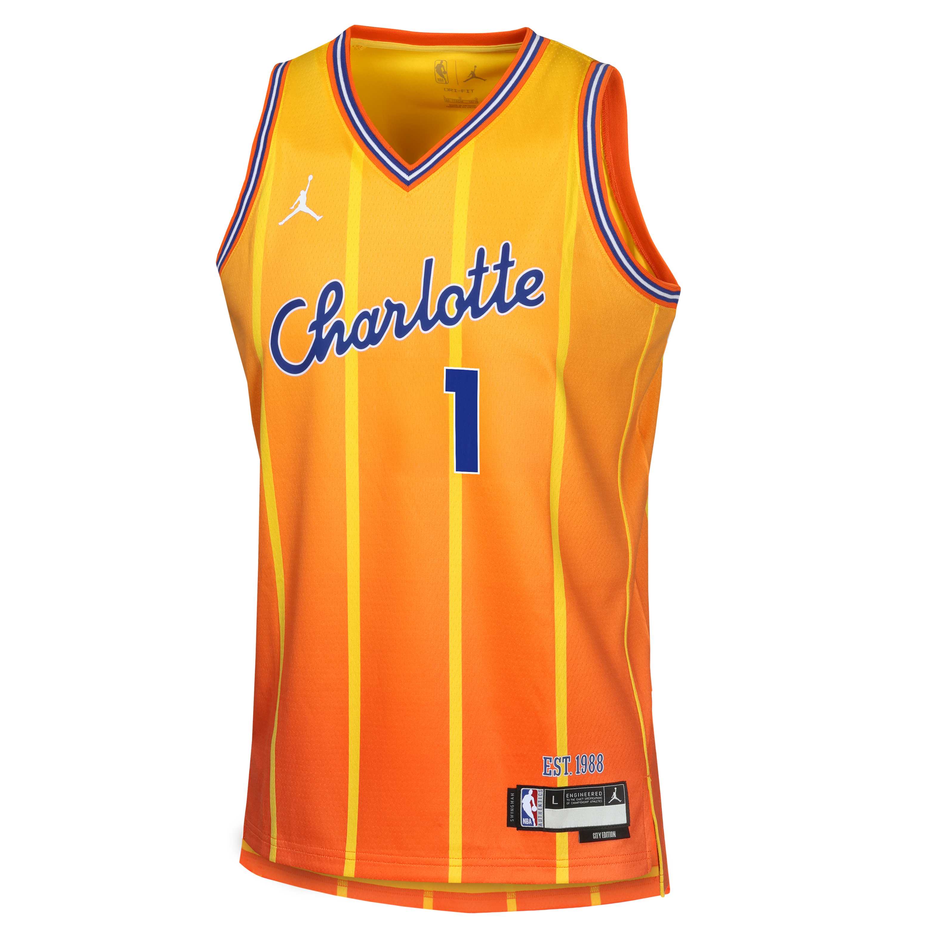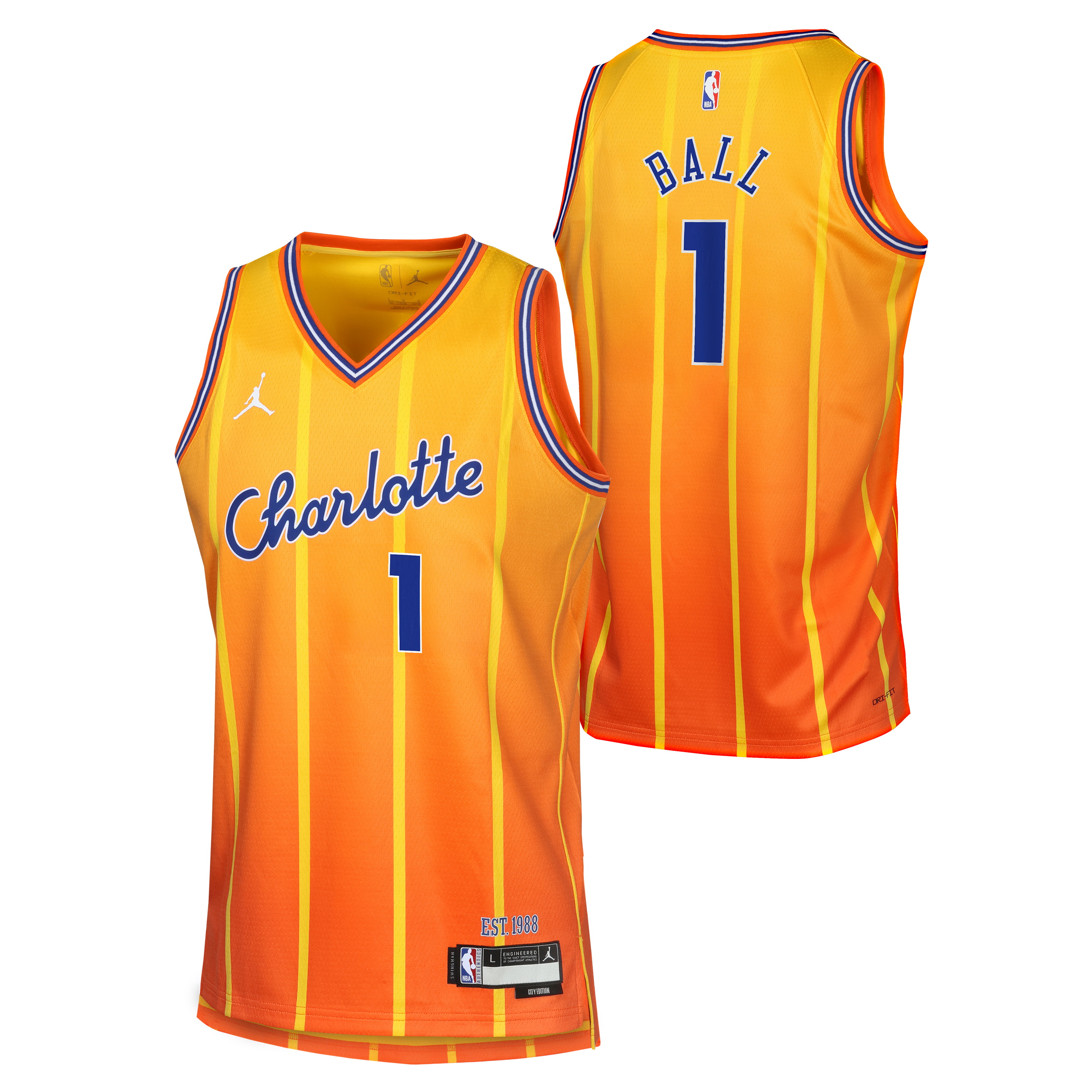 Inspiré de la tenue portée par LaMelo Ball lors des grands rendez-vous NBA, ce maillot arbore fièrement les couleurs dynamiques City Edition : le violet profond et les détails turquoise emblématiques des Hornets. Le numéro 1 et le nom Ball sont fidèlement reproduits, pour un rendu identique à celui que portent les stars sur le parquet du Spectrum Center.