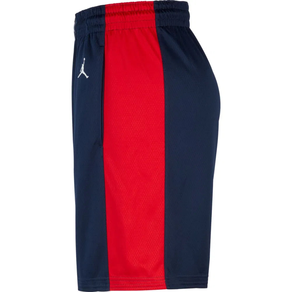 Visuellement, le short se distingue par ses couleurs emblématiques : bleu marine dominant avec des accents rouges et blancs, rappelant les couleurs du drapeau français. Le motif Jumpman, appliqué à chaud, symbolise l’alliance entre Jordan et l’équipe de France, tandis que l’étiquette cousue témoigne de l’authenticité du produit.