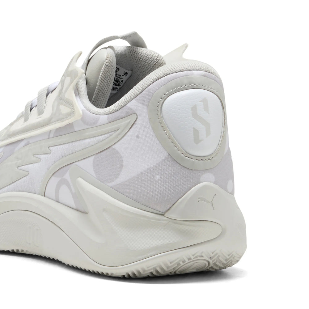 Côté technologie, la chaussure ne déçoit pas. La semelle extérieure en caoutchouc haute performance, appelée Puma Grip, assure une adhérence supérieure grâce à son motif résistant à l’abrasion. Cela permet des changements de direction rapides et contrôlés. Le PWRtape, quant à lui, ajoute de la stabilité sans compromettre la flexibilité, offrant une grande liberté de mouvement. La plaque TPU Proplate augmente la propulsion à chaque saut, tandis que la semelle intermédiaire Nitro garantit un excellent amorti, protégeant les articulations et réduisant la fatigue au sein de cette Puma Scoot Zeros II Glacial Gray.